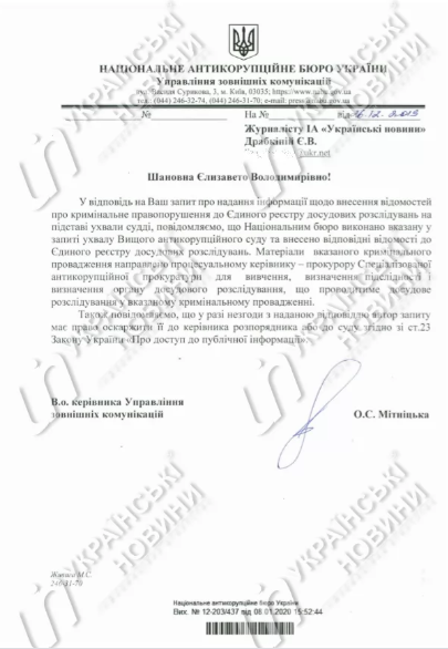 "Материалы указанного уголовного производства направлены процессуальному руководителю – прокурору Специализированной антикоррупционной прокуратуры для изучения, определения подследственности и определения органа досудебного расследования, который будет проводить досудебное расследование в указанном уголовном производстве", – сказано в ответе.
