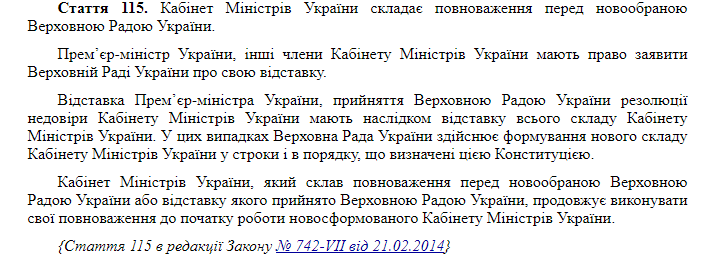 Статья 115 Конституции Украины: Отставка Кабинета Министров Украины вследствие отставки Премьер-министра Украины