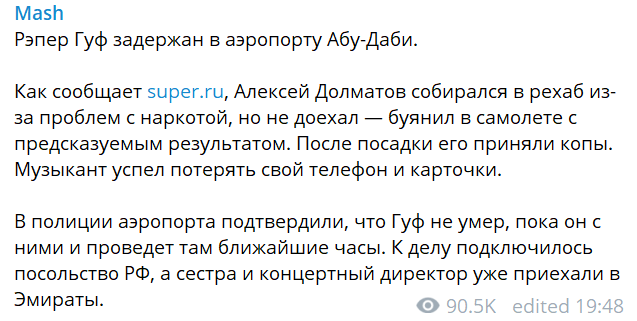 Российские информационные агентства сообщают о задержании в столице Объединенных Арабских Эмиратов российского рэп-певца Гуфа.