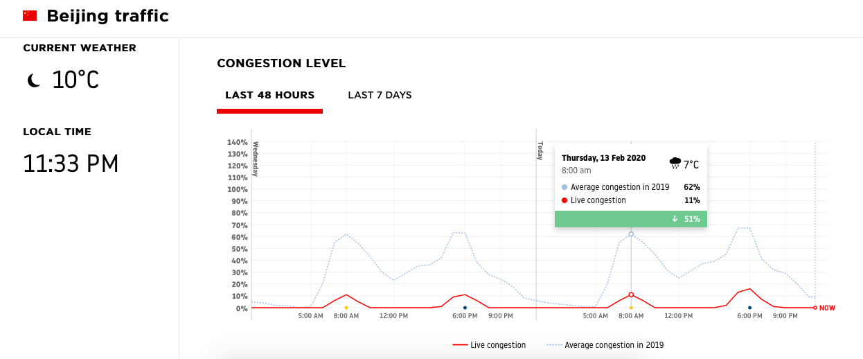 И еще один график. Дорожный трафик в Пекине сегодня по сравнению с тем же днем год назад.