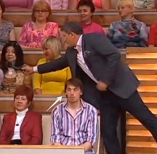 На другой – сидит в студии в массовке на записи одной из телепередач.