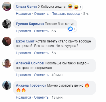 "У Кобзона аншлаг", "Побольше бы таких видео – настроение поднимает", "Красиво полетел", "Можно смотреть вечно", "Полетели лапти на родину", "С огоньком", "Спасибо за отличную работу и нашу защиту", – писали в сети.