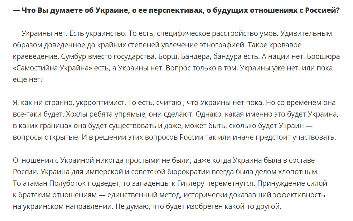 «Украины нет. Есть украинство. То есть, специфическое расстройство умов. Удивительным образом доведенное до крайних степеней увлечение этнографией. Такое кровавое краеведение. Сумбур вместо государства. Борщ, Бандера, бандура есть. А нации нет», — сказал Сурков.