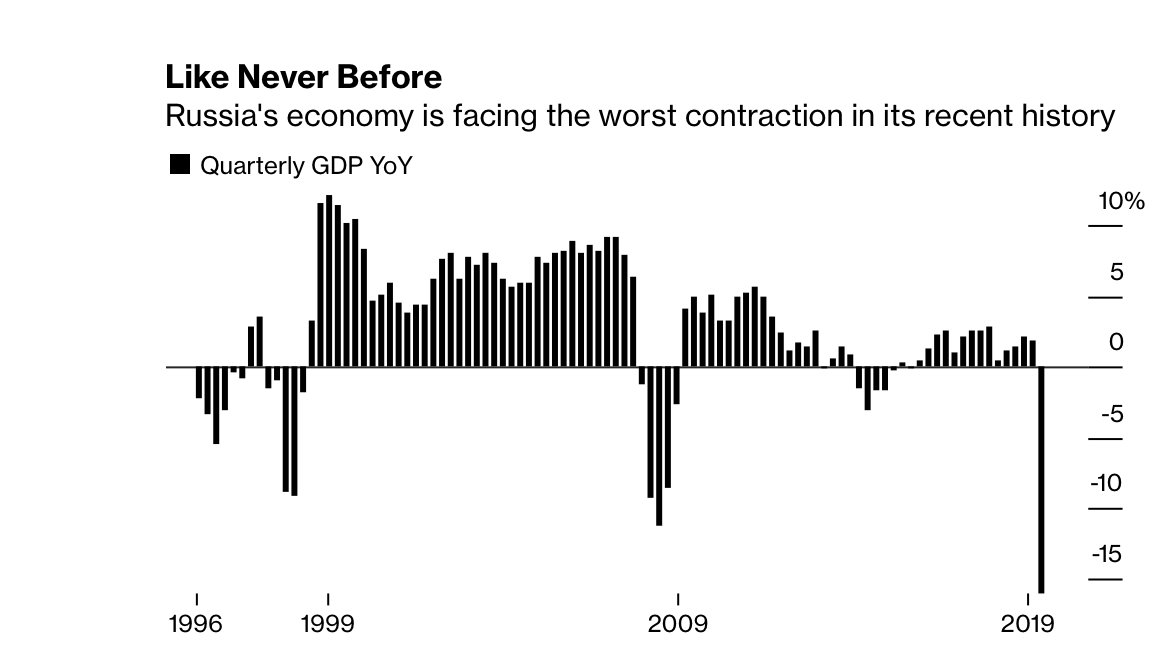 Агентство "Блумберг" полагает, что экономика России находится в гораздо более худшем положении, чем в любой момент своей новейшей истории. Сокращение экономики во втором квартале может составить 16%, причем есть иные оценки, которые дают еще более масштабное падение.