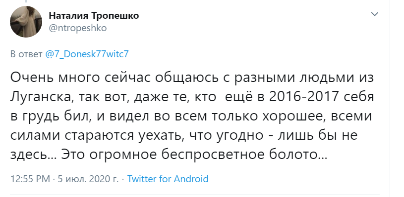 "Очень много сейчас общаюсь с разными людьми из Луганска, так вот, даже те, кто еще в 2016-2017-м себя в грудь бил, и видел во всем только хорошее, всеми силами стараются уехать, что угодно - лишь бы не здесь... Это огромное беспросветное болото..." - пишет женщина.