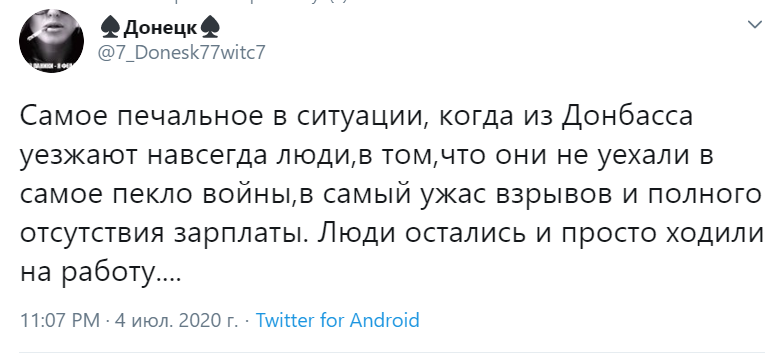 "Самое печальное в ситуации, когда из Донбасса уезжают навсегда люди, в том, что они не уехали в самое пекло войны, в самый ужас взрывов и полного отсутствия зарплаты. Люди остались и просто ходили на работу..." - пишет дончанка.