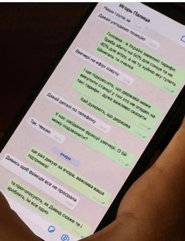 Глава энергетического комитета ВР Андрей Герус и нардеп Игорь Палица согласовывают позицию по тарифам для «зеленой» энергетики. Соответствующее фото переписки у себя на странице в Facebook опубликовала нардеп от «Европейской солидарности» Виктория Сюмар.