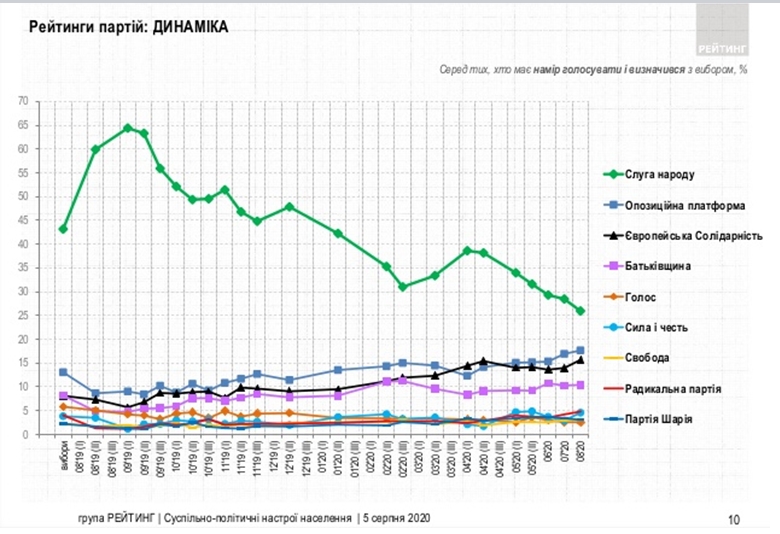 Лидерами электорального рейтинга политических сил на выборах в парламент являются партии "Слуга народа", "Оппозиционная платформа - За жизнь", "ЕС" и ВО "Батькивщина".