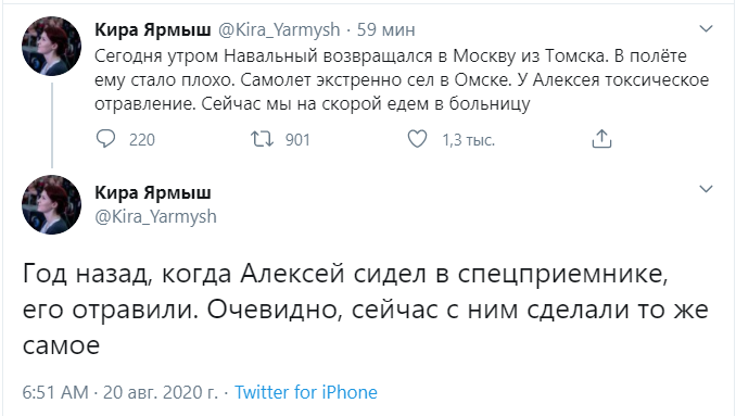 «Сегодня утром Навальный возвращался в Москву из Томска. В полёте ему стало плохо. Самолет экстренно сел в Омске. У Алексея токсическое отравление. Сейчас мы на скорой едем в больницу», - сообщила Ярмыш в 6:43 четверга.
