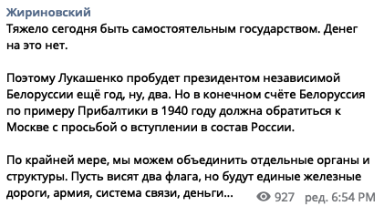 "Тяжело сегодня быть самостоятельным государством. Денег на это нет. Поэтому Лукашенко пробудет президентом независимой Белоруссии еще год, ну, два", - написал российский политик.