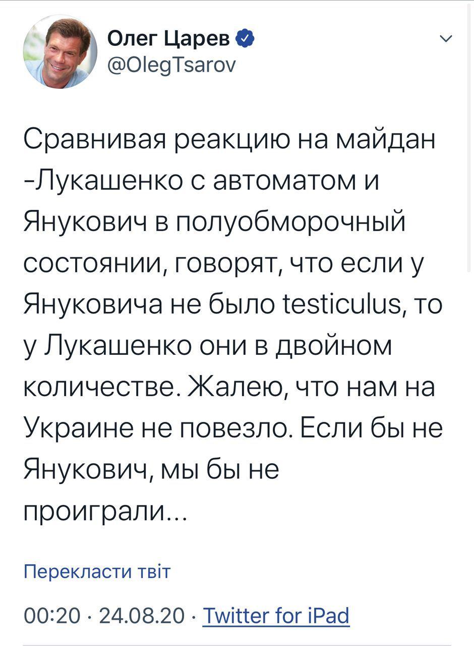 "Сравнивая реакцию на Майдан - Лукашенко с автоматом и Янукович в полуобморочном состоянии . Говорят, что если у Януковича не было testiculus, то у Лукашенко они в двойном количестве. Жалею, что нам в Украине не повезло. Если бы не Янукович, мы бы не проиграли", - написал бежавший в аннексированный Крым экс-депутат.