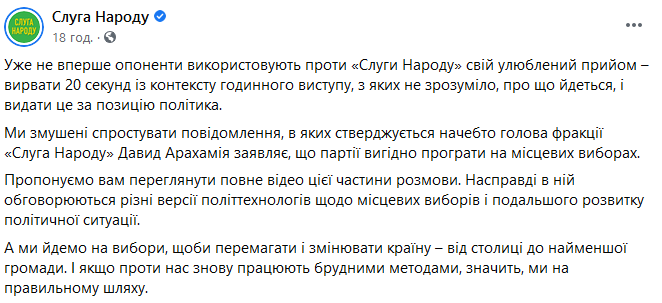 В свою очередь, в партии "Слуга народа" заявили в Facebook, что слова Арахамии были вырваны из контекста. На самом деле он якобы обсуждал "разные версии политтехнологов о местных выборах и дальнейшем развитии политической ситуации".