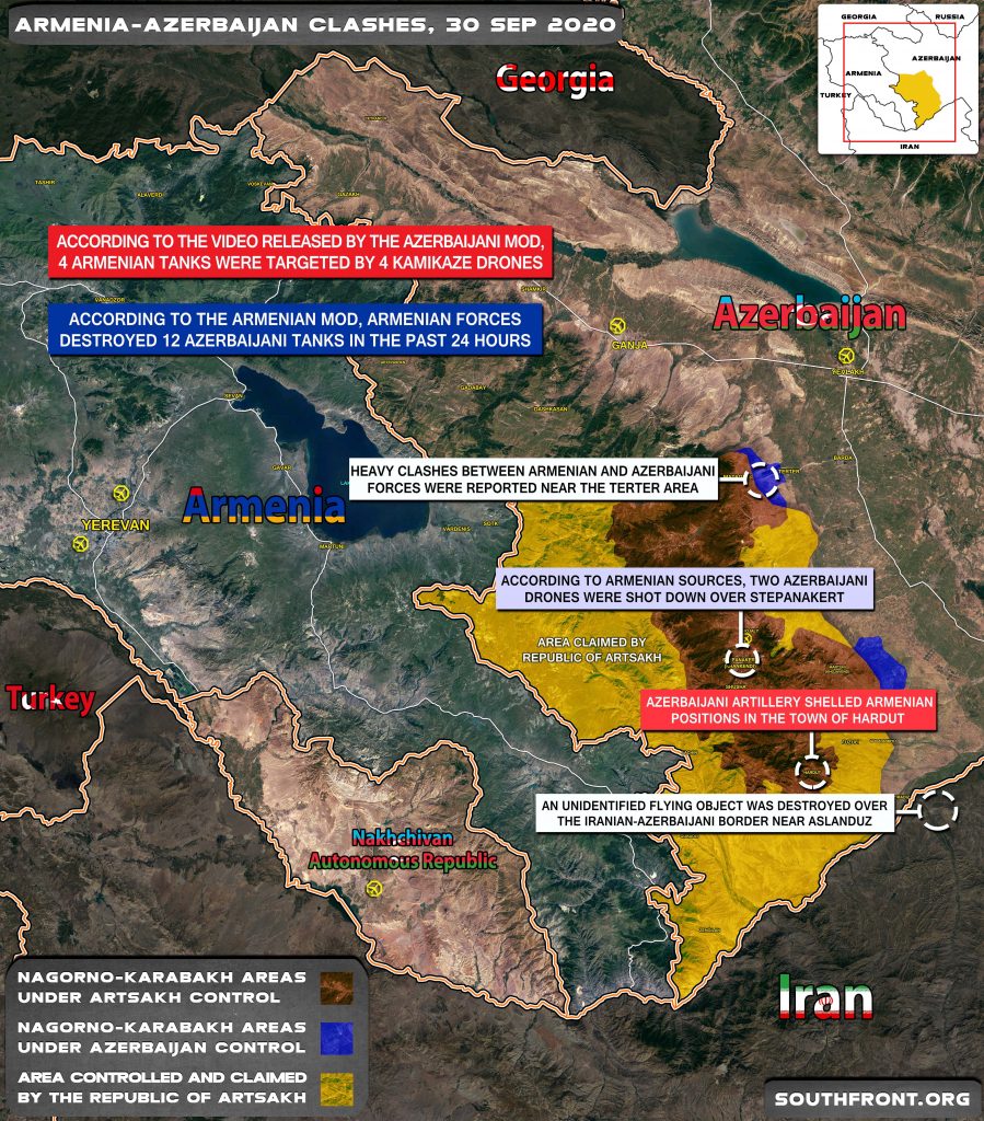 Азербайджан заявил что, его войска за 30 сентября уничтожили и вывели из строя две боевые машины зенитно-ракетного комплекса "ОСА-АКМ", одну реактивную систему залпового огня "Ураган", четыре реактивные системы залпового огня БМ-21 "Град", четыре гаубицы-пушки Д-20, 16 танков, одну боевую машину пехоты и два грузовика с личным составом.