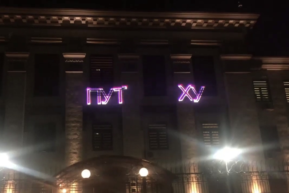 Участники с помощью проектора вывели на стену здания стоки знаменитой кричалки харьковских ультрас: "Путин - х***о".