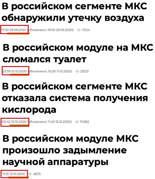 Небольшая утечка воздуха на МКС произошла в сентябре 2019 года. В августе-сентябре 2020 года экипаж дважды закрывал люки в модулях станции, чтобы проверить их герметичность.