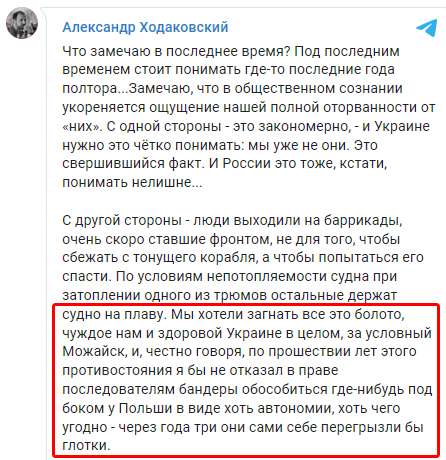 "По условиям непотопляемости судна при затоплении одного из трюмов остальные держат судно на плаву. Мы хотели загнать все это болото, чуждое нам и здоровой Украине в целом, за условный Можайск, и, честно говоря, по прошествии лет этого противостояния я бы не отказал в праве последователям Бандеры обособиться где-нибудь под боком у Польши в виде хоть автономии, хоть чего угодно: через года три они сами себе перегрызли бы глотки", - пишет Ходаковский.