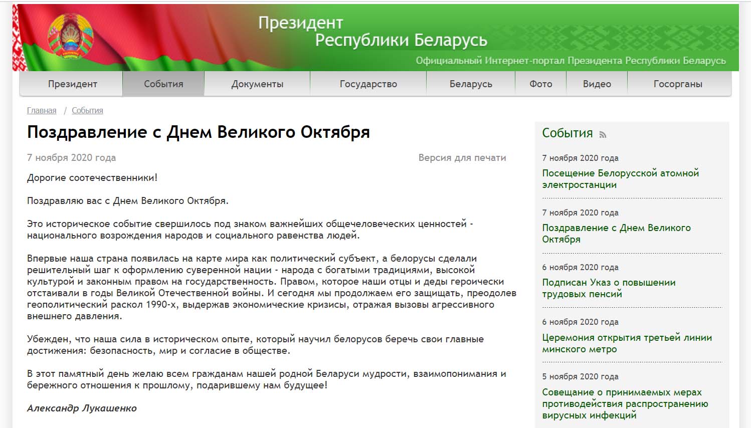 Поздравление опубликовано на официальном сайте Лукашенко. Как отмечает TUT.BY, раньше в таких поздравлениях всегда звучало полное название праздника – День Октябрьской революции.