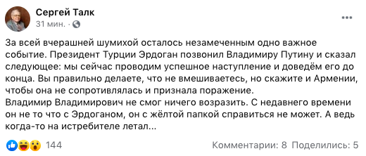"Эрдоган позвонил Путину и сказал следующее: мы сейчас проводим успешное наступление и доведем его до конца. Вы правильно делаете, что не вмешиваетесь, но скажите и Армении, чтобы она не сопротивлялась и признала поражение", - написал Талк.