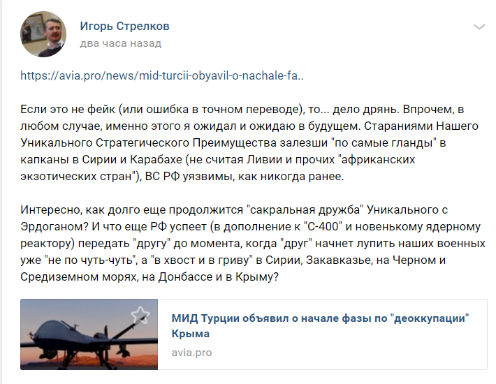 Накануне турецкий МИД посредством главы ведомства Мевлюта Чавушоглу сделал заявление о том, что Анкара провела с Киевом переговоры и начинает активную фазу действий по деоккупации Крымского полуострова. В ответ Стрелков заявил, что для России "дело дрянь".