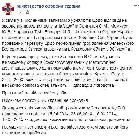 Тогда ведомство ответило, что в 2014-2015 годах Зеленскому четыре раза направлялись повестки о призыве на службу по мобилизации, а тот четыре раза их проигнорировал.