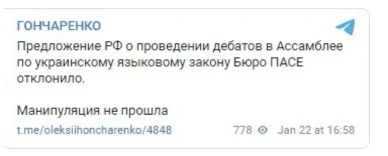 20 января Гончаренко опубликовал фотокопию письма главы делегации РФ Петра Толстого к председателю ПАСЕ Хендрику Дамсу. В нем россияне утверждают, что вступление в силу ст. 30 закона Украины "Об обеспечении функционирования украинского языка как государственного" стало этапом "тотальной украинизации общественной жизни в Украине".