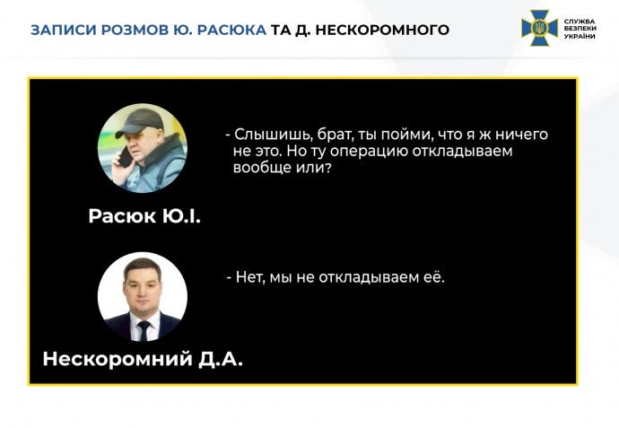 В СБУ подчеркнули, что генерал Нескоромный вместе с сотрудником антитеррористического центра Юрием Расюком приняли решение убить Наумова. При этом обвинения в спецслужбе подтверждают аудиозаписями разговором Расюка с Нескоромным и другими лицами, в которых фигуранты обсуждают убийство.