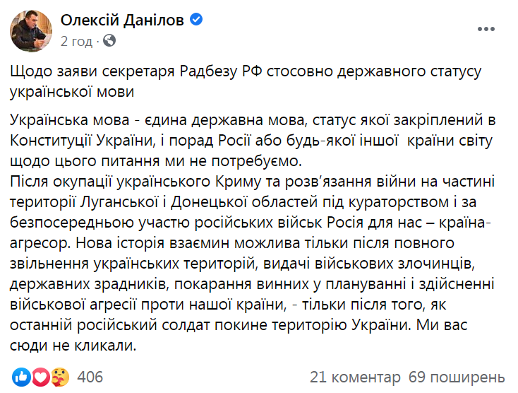 "Украинский язык – единственный государственный язык, статус которого закреплен в Конституции Украины, и в советах России или любой другой страны мира по этому вопросу мы не нуждаемся. После оккупации украинского Крыма и развязывания войны на части территории Луганской и Донецкой областей под кураторством и при непосредственном участии российских войск Россия для нас – страна-агрессор", – подчеркнул секретарь СНБО.