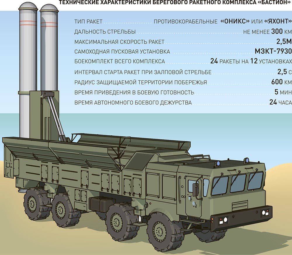 Предназначение «Бастиона» — защита побережья длиной более 600 км и поражение надводных судов. Страна-агрессор доказывает, что комплекс способен попадать в морские цели на расстоянии 350 км, в наземные — на расстоянии 450 км. «Бастионы» развернуты на Курилах, в Калининградской области и Сирии.