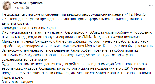 "Владимир Зеленский сделал то, что почему-то не сделал Петр Порошенко. Наконец, пророссийские каналы в Украине получили то, что они заслуживали давно. Это - враги, это - агенты России. Призываю коллег не брать на работу никого из тех, кто работал на Россию. Слава Соединенным Штатам! Смерть всем врагам!"