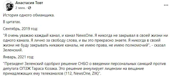 Вечером 2 февраля президент Владимир Зеленский ввел решение СНБО о введении персональных санкций против депутата ОПЗЖ Тараса Козака. В том числе речь идет об аннулировании лицензий на вещание принадлежащих ему телеканалов 112, NewsOne и ZIK.