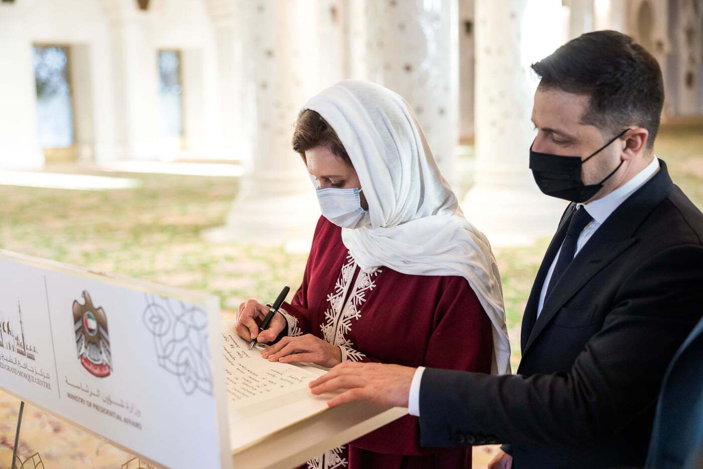 Первая леди Украины Елена Зеленская в традиционном для арабских женщин наряде посетила Большую мечеть шейха Зайда в столице ОАЭ Абу-Даби.