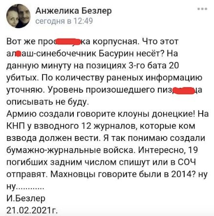 "Что этот ал*аш-синебочечник Басурин несет? На данную минуту, на позициях 3-го бата 20 убитых. По количеству раненых информацию уточняю. Уровень произошедшего пиз***а описывать не буду", - написал бывший главарь боевиков.