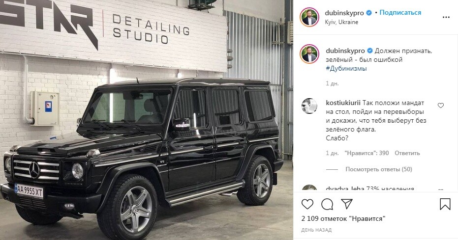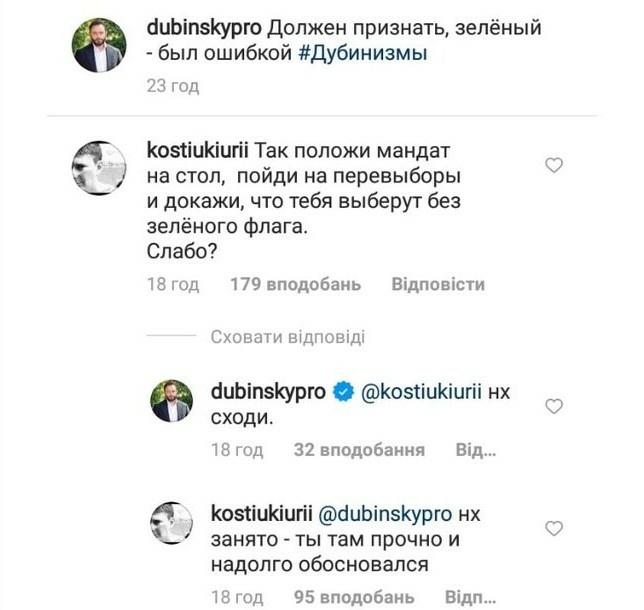 Дубинский 13 марта опубликовал в своем Instagram пост с подписью "Должен признать, зеленый – был ошибкой". В комментарии к нему пришел Костюк и призвал сложить мандат и пойти на перевыборы.