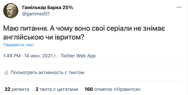 А где этот путь у того, что выбрали эти деятели? Нет? Так тогда кого с кем сравнивают? Но хорошо. Тогда возвращаемся к сути вопроса и попытаемся выяснить, отчего же эта бригада снимает кино на русском языке? Почему не на английском или иврите? Именно так и был поставлен вопрос вчера днем. Вот он.