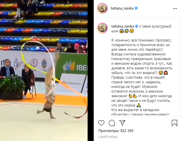 Ранее жена Дмитрия Пескова, пресс-секретаря президента РФ Владимира Путина, отметилась сексистским заявлением, написав у себя в Instagram, что мужчинам не место в художественной гимнастике, и опубликовала видео с выступлением испанца.