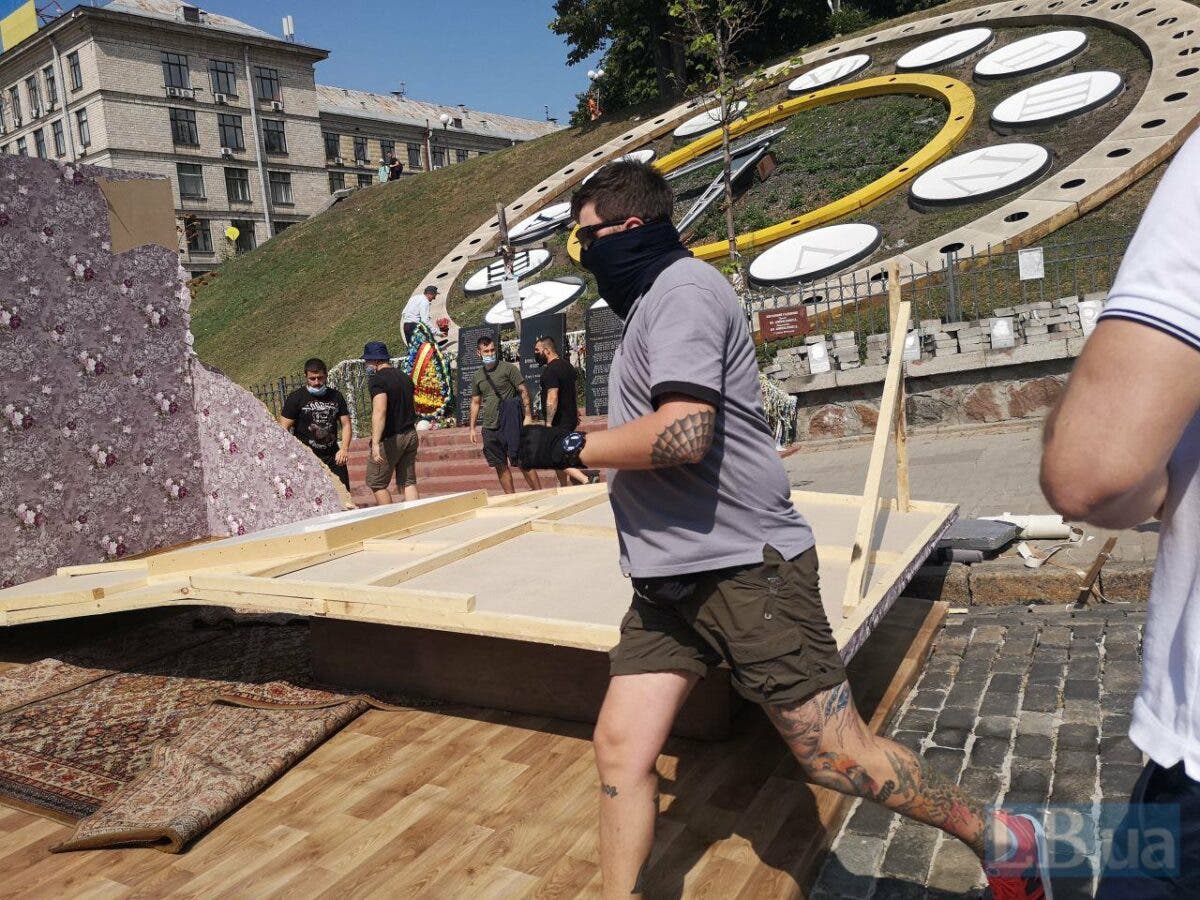 В Киеве на Аллее Героев Небесной Сотни неизвестные активисты начали ломать декорации, которые закрывают портреты погибших.