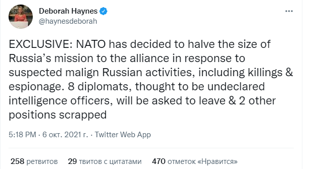 Позже в эфире телеканала, Хейнс добавила, таким образом число дипломатов российской миссии в НАТО сократится до десяти. Согласно информации, которую она получила от информированного источника, кардинальное решение было принято, основываясь на докладе государств-членов альянса.