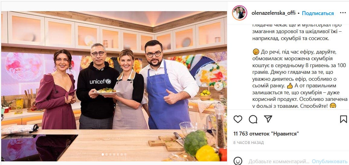 Зеленская отметила, что важнее всего самостоятельно готовить не переработанные и простые продукты. При этом она заявила, что замороженная скумбрия, из которой можно приготовить много замечательных блюд, стоит около 8 гривен за один килограмм. Также Зеленская добавила, что в ее семье едят блюда из замороженной скумбрии.