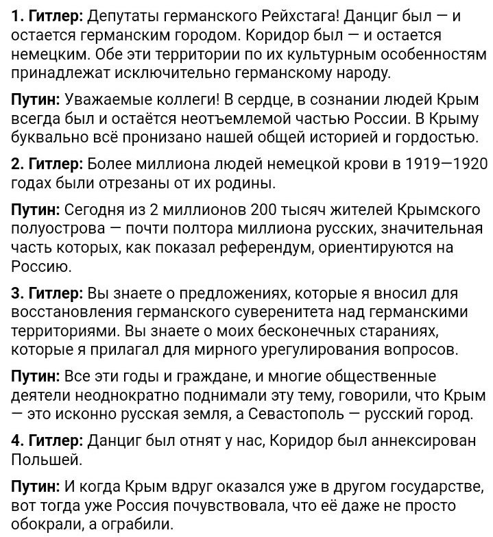 Эти особенности становятся уже не просто заметными, но и навязчивыми. Проще говоря, практически все действия или выражения Путина так или иначе перекликаются с тем, что было сказано Гитлером или Сталиным.