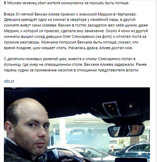 В протоколе, конечно же, записали, что Олег Слюсаренко вежливо попросил Бекхана вести себя тише, мол, время позднее, шум мешает спать. И тут, внезапно — мы же помним, что все присутствующие в квартире люди вежливые, началась драка. Алиев достал нож. С десятком ножевых ранений шеи, живота и спины Слюсаренко попал в больницу, где умер на операционном столе. Бекхана Алиева задержали.