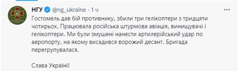 «Воины НГУ были вынуждены нанести артиллерийский удар по аэропорту, на котором высадился вражеский десант. Бригада перегруппировалась. Данные о потерях уточняются. По результату боя гвардейцам удалось сохранить максимум личного состава», — говорится в сообщении.