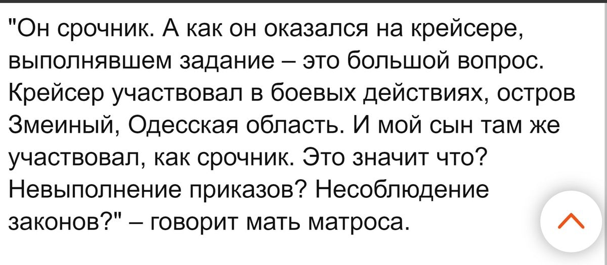 Об этом рассказала мать матроса-срочника из членов экипажа затонувшего флагмана Черноморского флота, из которого выпускали ракеты по украинским городам. В интервью "Радио Свобода", она сначала сказала, что корабль якобы не шел на боевой выход, когда в него попали ракеты.
