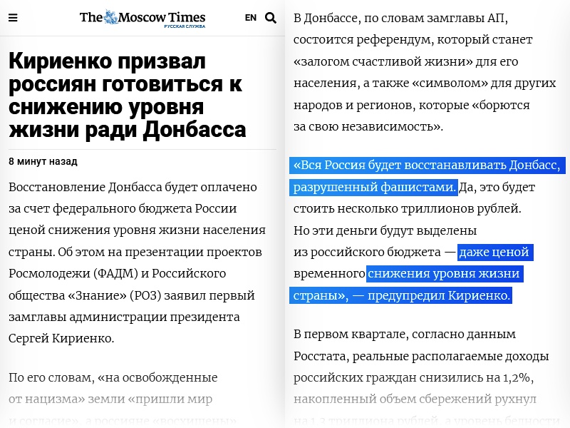 На сайте российского издания «Известия» появилось — и пропало «обращение» первого замглавы администрации Путина Сергей Кириенко о «восстановлении Донбасса даже ценой снижения уровня жизни в России». На это обратили внимание российские журналисты.