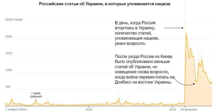 Сообщения про нацизм резко возросли до беспрецедентного уровня 24 февраля, в день полномасштабного нападения рф на Украину. С тех пор их количество остается на довольно высоком уровне. Данные включают в себя основные российские государственные СМИ, а также тысячи небольших российских веб-сайтов и блогов.