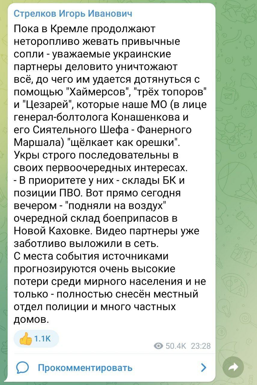 Алкголик Игорь Стрелков-Гиркин проснулся от ... Нет, не взрывов в Новой Каховке, а от взрывов ватных задниц и прям спросонья принялся за старое