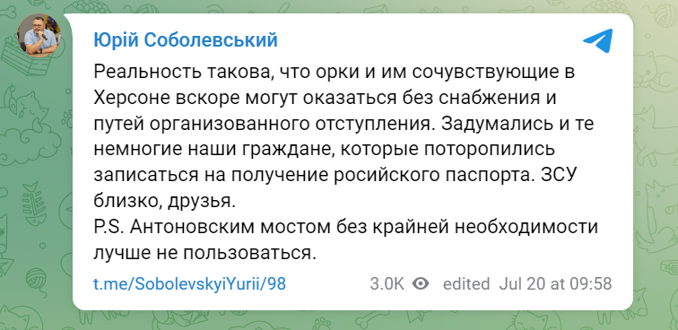 После подрыва Антоновского моста в Херсоне оккупанты могут остаться без путей для отступления, считает заместитель председателя Херсонского облсовета Юрий Соболевский.