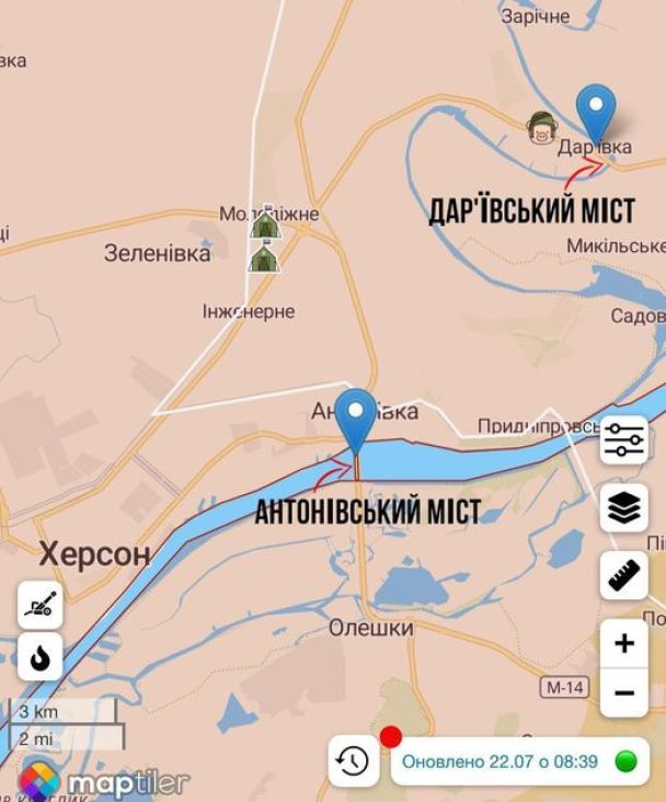 Единственный мост из-за реки Ингулец поврежден, однако пока движение по нему сохраняется. Информация об этом, а также видео с поврежденного моста разлетелись по российским пабликам.