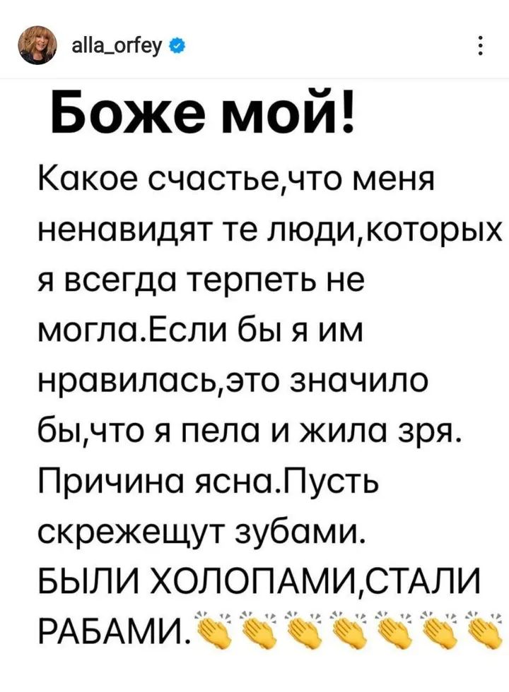 "Боже мой! Какое счастье, что меня ненавидят те люди, которых я всегда терпеть не могла. Если бы я им нравилась, это значило бы, что я пела и жила зря. Причина ясна. Пусть скрежещут зубами. Были холопами – стали рабами", – написала певица.