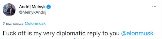 Среди прочего Маск заявил, что он последовал совету бывшего посла Украины в Германии Андрея Мельника, который послал бизнесмена к черту, после обнародования плана, предусматривающего «референдумы» под наблюдением ООН во временно оккупированных Россией областях и возобновление Украиной подачи воды в Крым.