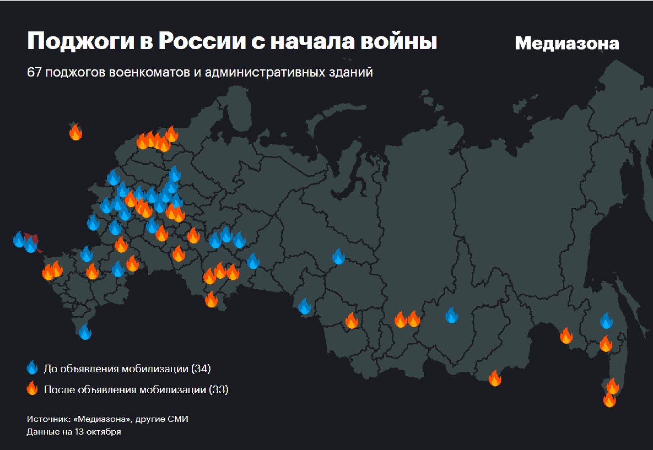 В Сети уже есть интерактивная карта таких происшествий. По данным "Медиазоны", по состоянию на 13 октября стало известно о 67 нападениях с начала войны (34 – до начала мобилизации и 33 – после). В 47 случаях это ожидаемо были здания Минобороны – военкоматы и призывные пункты.